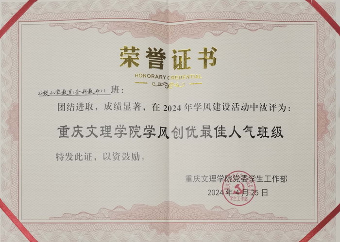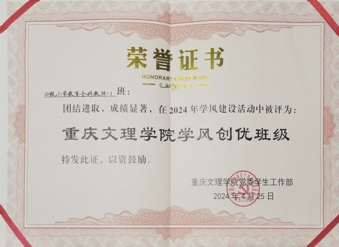 太阳网集团tcy87222022级小学教育全科1班被评为“学风创优班级”