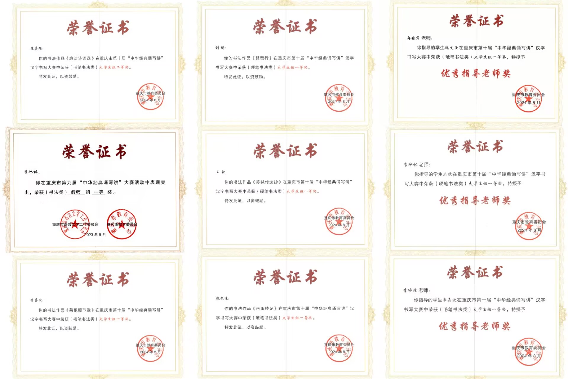 在重庆市级的选拔中,员工魏文佳、刘境、教师李冰林3人均荣获一等奖。本次比赛中荣获重庆市一等奖的员工还有:2021级小学教育(师范)专业李嘉欣(毛笔)、2022级小学教育(全科教师)专业王钦(硬笔)2人。另外2022级小学教育(师范)专业员工陈嘉瑶(毛笔)1人荣获二等奖。教师李冰林、冉晓芹2人获优秀指导教师奖。