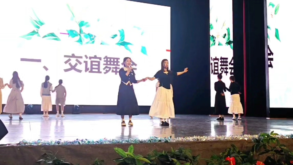 暖场环节由2024级音乐学1班表演的合唱《萱草花》、2024级舞蹈学3班的古典舞《淡妆浓抹总相宜》、组合表演唱团“风信子”组合的歌曲《木叶吹呀吹》,为师生带来美的熏陶;游戏环节的击鼓传花,全场参与,气氛热烈;交谊舞环节,由教学、领舞、随机跳舞、T台秀组成,形式多样、效果显著。