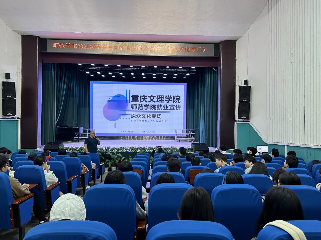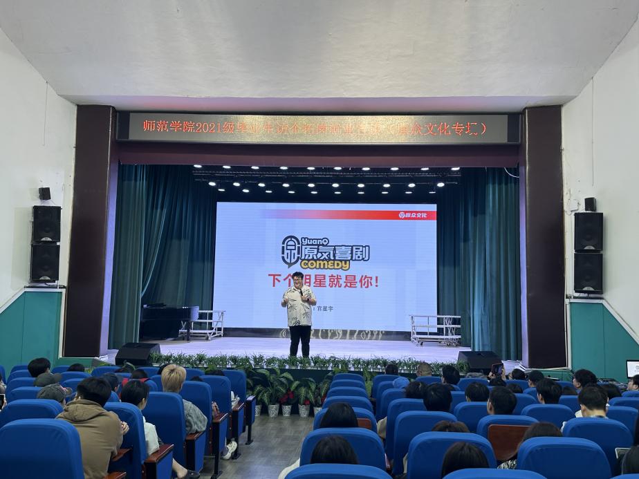 10月17日中午,太阳网集团tcy8722在星湖校区演奏厅成功举办原众文化专场招聘会。原众文化董事长胡焕阳一行,公司党委副书记/纪委书记隋剑飞、学工办主任范宣辉以及2021级音乐学(师范)、舞蹈学专业全体毕业生参与了此次招聘。