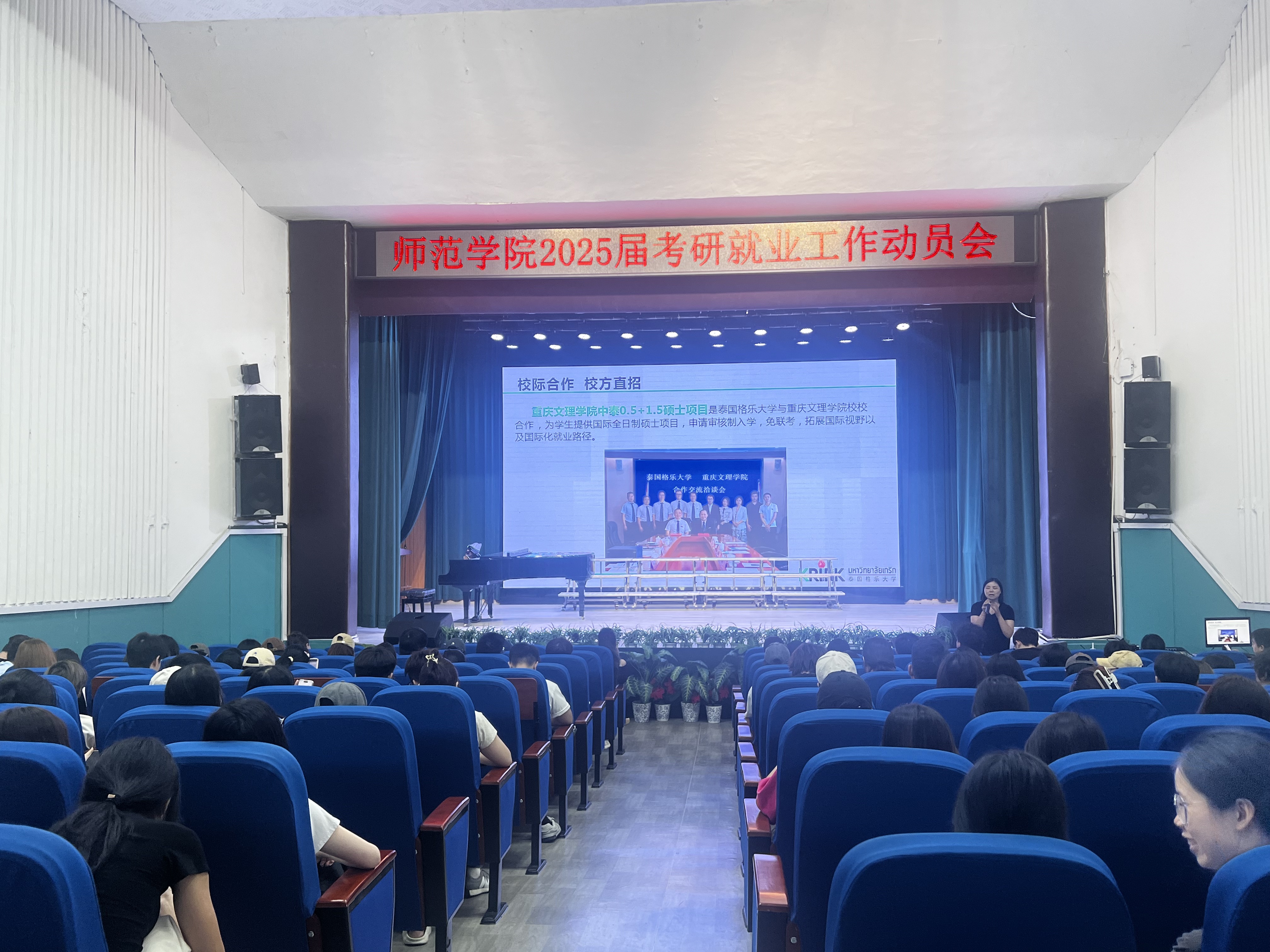 泰国格乐大学与公司签订了硕士公司产品项目,与音乐学和舞蹈学专业相匹配的硕士招生专业为音乐与舞蹈学、教育管理等,所以太阳网集团tcy8722特意邀请了泰国格乐大学中国西南片区负责人蒋文霞,从专业发展、公司环境、国家要求等方面为同学们详细地做了介绍,并对比分析了国内外考研优劣势。